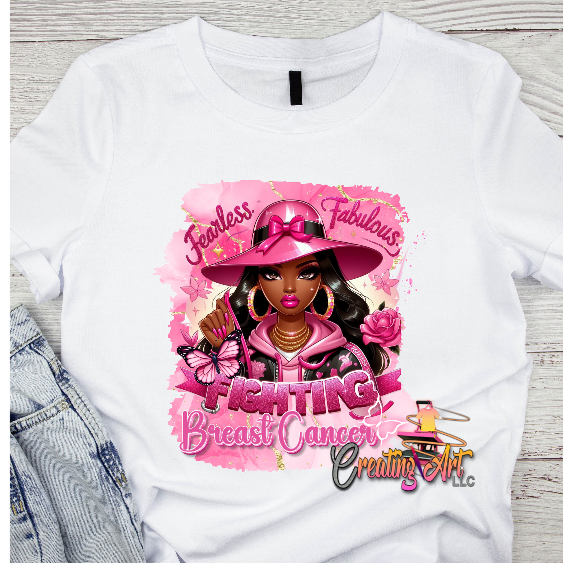 Show your strength, style, and support with our “Fearless & Fabulous Fighting Breast Cancer” T-Shirt. This bold design features a confident woman in pink surrounded by butterflies, roses, and the powerful message Fearless, Fabulous, Fighting Breast Cancer. It’s more than a shirt — it’s a statement of courage, empowerment, and unity.