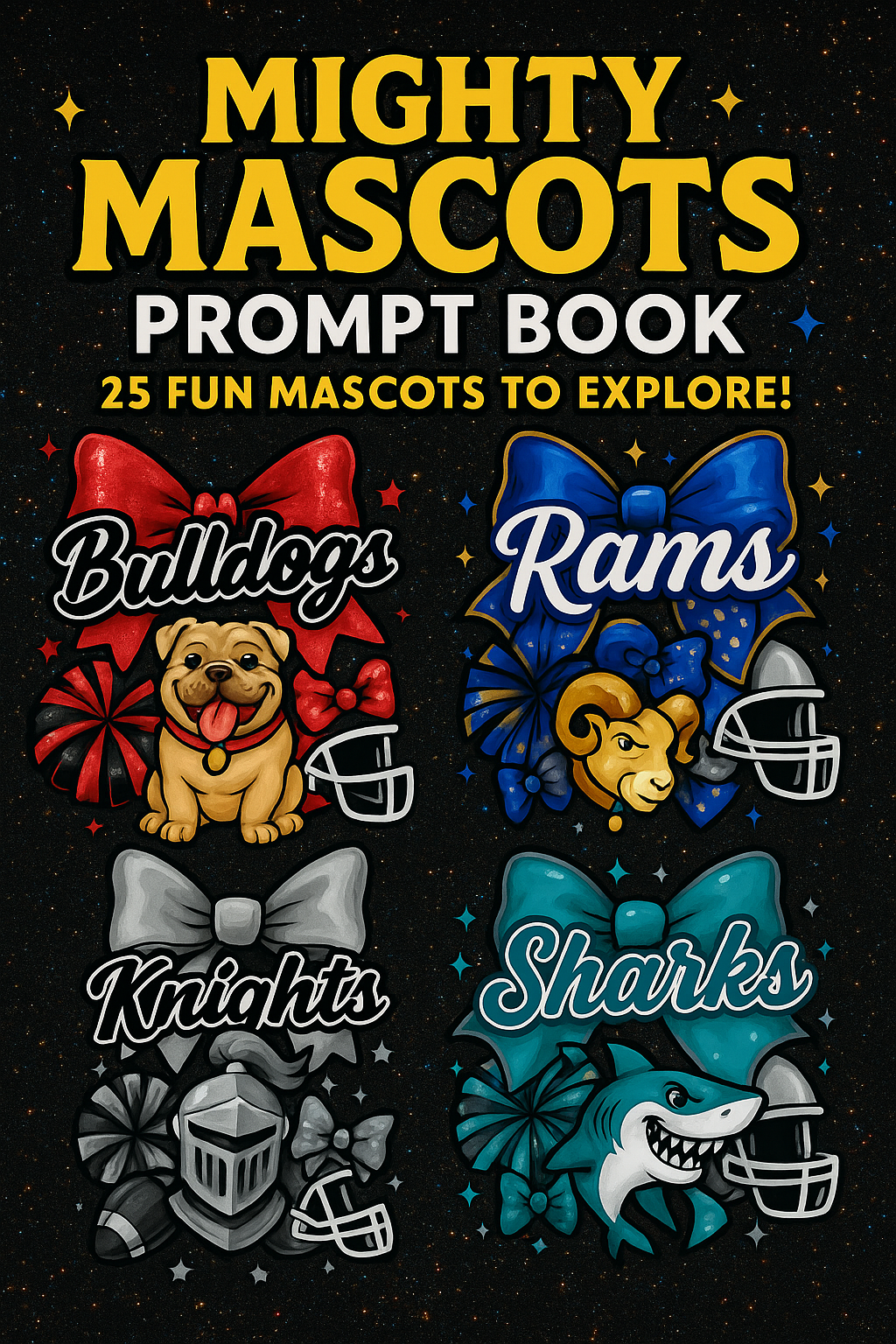 Unleash your creativity with the Mighty Mascots Prompt Book — featuring 25 fun and vibrant mascot designs ready to spark ideas for art, apparel, and more! Inside, you’ll find bold, high-quality illustrations of fan-favorite mascots like Bulldogs, Rams, Knights, and Sharks, each paired with colorful accessories and sports-themed elements. Perfect for digital artists, crafters, and print-on-demand sellers, this book offers endless inspiration for custom projects. Whether you’re designing t-shirts, stickers, or digital downloads, these prompts will keep your ideas flowing and your creations eye-catching